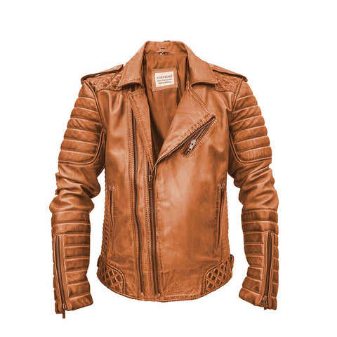 V VENTURE Men's Tan Leather Jacket Large with Quilted Padding